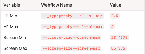 )Note: Webflow uses its own variable naming convention (e.g., --_typography---h1--h1-min). Make sure your variable names match what's defined in your Webflow project settings.